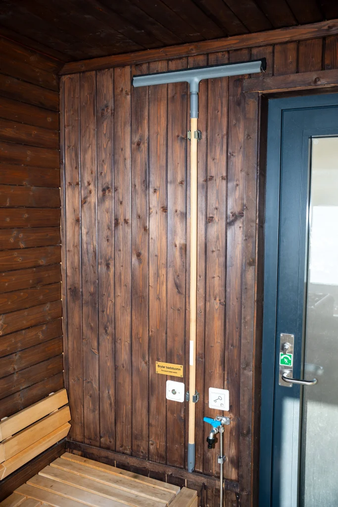 Ver vennleg å kost golvet og fjern eventuelt rusk i sluket i badstova før du startar. Kost og feiebrett finst under benken på høgre sida av døra